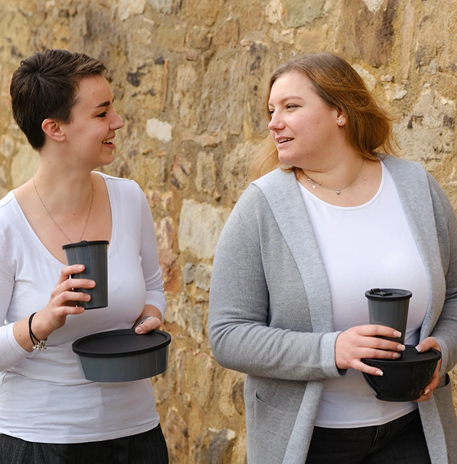 The sustainable zero waste-series can also be decorated individually. The cups and bowls can be printed in one or more colours with your company logo or an individual motif or vignette. Show your customers or employees your sense of ecological responsibility and use tableware that is manufactured according to the rules of the circular economy. For your individual tableware offer, please contact our customer service.