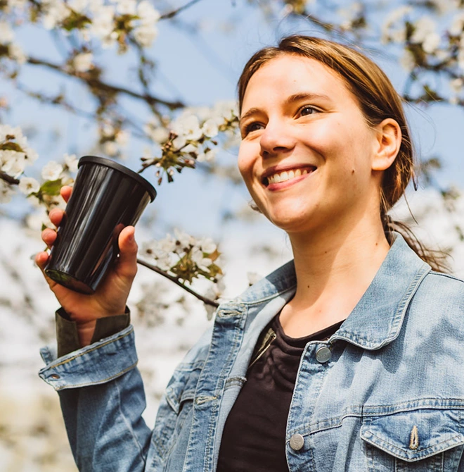 Disposable plastic in overcrowded bins is out - reusable is in. The high-quality, stable ORNAMIN to go cups are available in three sizes, in many colours and designs, so everyone can find the right cup for their drink on the go. Filled up at the coffee machine, at the bakery or at the petrol station, you can safely drive along with the break-proof and spill-proof cup. The high-quality plastic cup is easy to handle even when filled with hot drinks, because it does not get as hot as porcelain or disposable cups made of paper or plastic. It is also microwaveable in case the drink needs to be reheated. All ORNAMIN products are free of harmful substances and 100% Made in Germany.